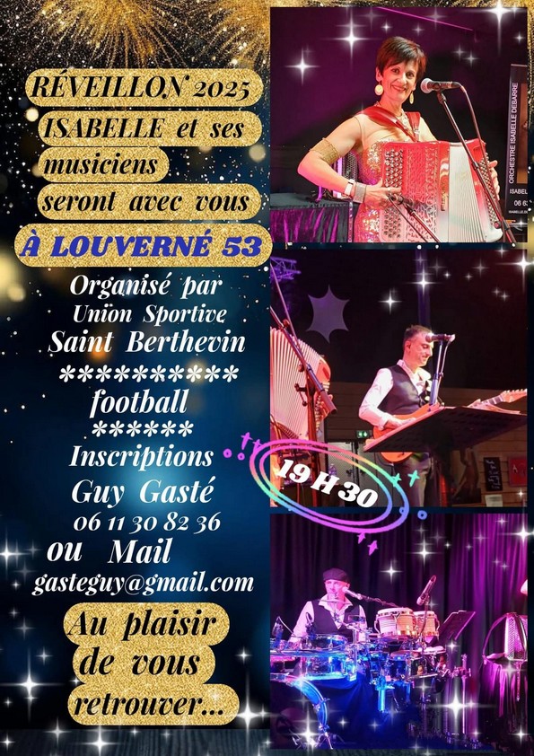 | salle les Pléiades , Superbe réveillon annuel .Repas dansant. Organisé par l'Union sportive St Berthevin Guy Gaste 06 11 30 82 36